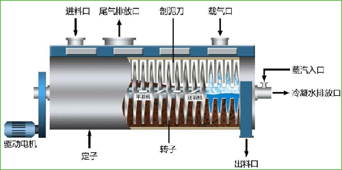 1、干燥機圓筒體是夾套型構造,主軸、圓盤內(nèi)中空,有蒸汽流通,換熱面積非常大,小機體大換熱面結構是高效率的保障,單軸無推力設計是低電耗的保障;